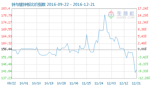 12月21日鋅與鍍鋅板商品比價指數(shù)為142.97,較昨日上升了1.89點,較周期內(nèi)更高點179.56點(2016-11-28)下降了20.38%,較2012年06月28日更低點96.53點上漲了48.11%。(注:周期指2012-01-01至今)
